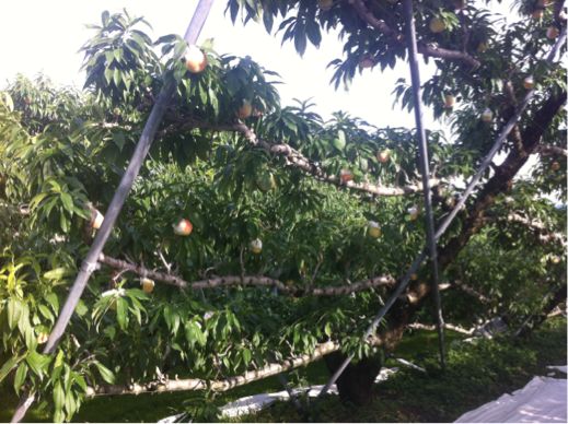 当園では、その「いちのみや」でもまだ大変に珍しい「Y字栽培」という新しい独特の方法をいち早く取り入れた桃の栽培を行っています。この方法だと日光の当たり方が格段に違うのです!!