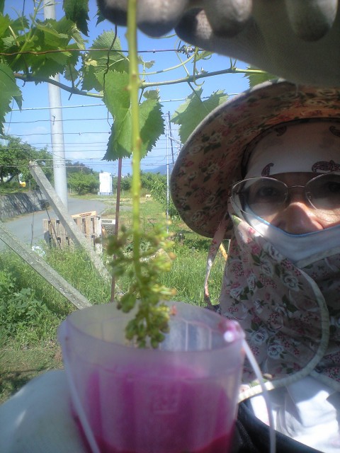 この作業は巨峰の花が満開で咲いている房を4cm位に切っていきます。