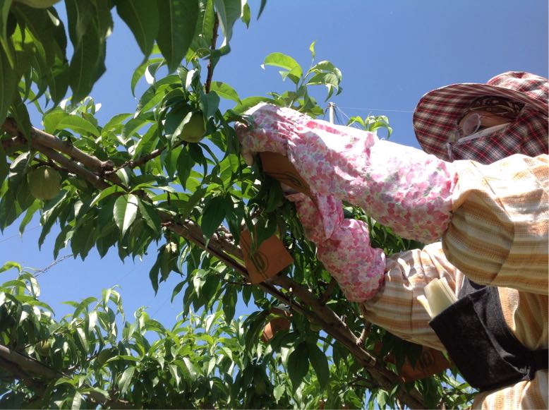 桃の実も大きくなり、摘果作業の真っ最中です。
