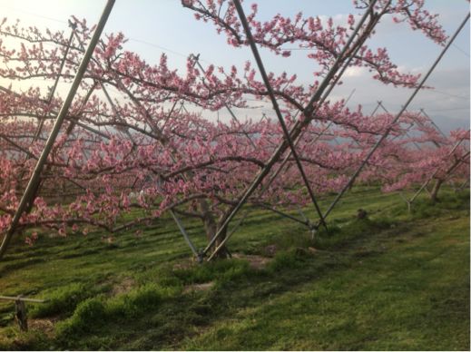 日本一の桃の里「いちのみや」 当園では、その「いちのみや」でもまだ大変に珍しい「Y字栽培」という新しい独特の方法をいち早く取り入れた桃の栽培を行っています。この方法だと日光の当たり方が格段に違うのです!!